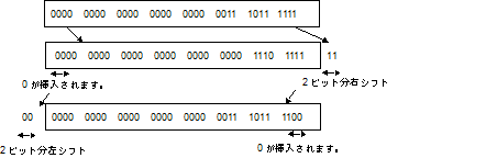 シフト数が0の場合は,第1項の値がそのまま返されます。シフト数が31を越えた場合は,0が返されます。