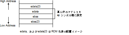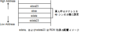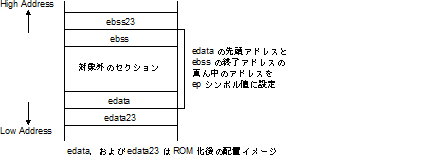 <3> | アドレスの小さい方から,edata,ebssセクションの順で配置し,edata,ebssセクションの間に対象外のセクションが存在している場合 |