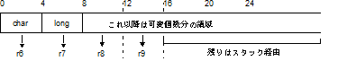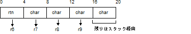 char型の引数4個を渡すだけでも,戻り値によっては,4番目の引数がスタック渡しとなる場合があります。
