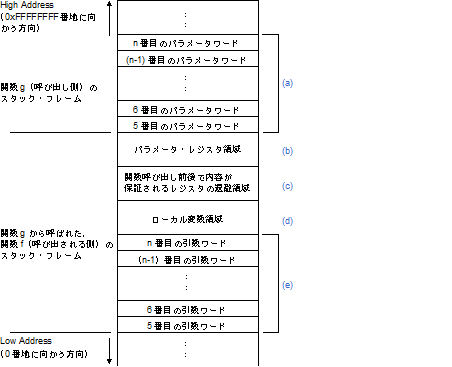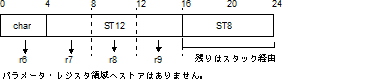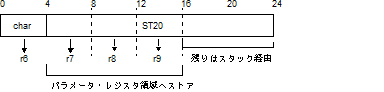 たとえば,サイズが20バイトの構造体引数を値渡しする場合,16バイトはr6〜r9 で,残りの4バイトはスタック(5 番目のパラメータ・ワード)として渡されます。