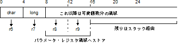 なお,構造体や共用体が,パラメータ・レジスタとスタックにまたがっていない場合は,パラメータ・レジスタ領域へのストアは不要になり,パラメータ・レジスタ領域はサイズ0バイトとなります。