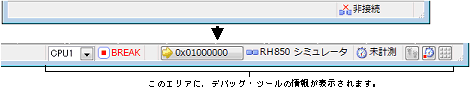 デバッグ・ツールとの接続に成功すると,メイン・ウインドウのステータスバーが,次のように変化します。