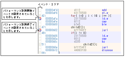 パフォーマンス計測開始イベント/パフォーマンス計測終了イベントは,キャレット位置の行に対応する先頭アドレスの命令に設定されます。
