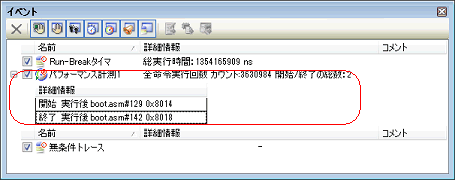 計測結果は,プログラムの実行停止後,[表示]メニュー→[イベント]の選択によりオープンするイベント パネルにおいて,パフォーマンス計測イベントして次のように確認することができます。