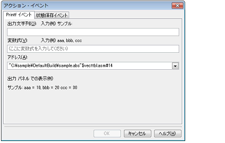 アクション・イベントの1つであるPrintfイベントを設定することにより,プログラムの実行を任意の箇所で一瞬停止させたのち,ソフトウエア処理によりprintfコマンドを実行させ,指定した変数式の値を出力 パネルに出力することができます。