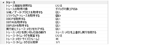 設定は,プロパティ パネル[デバッグ・ツール設定]タブ上の[トレース]カテゴリ内で行います。