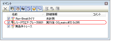 また,イベント パネルにおいて,ハードウエア・ブレーク・イベント(実行系)/ソフトウエア・ブレーク・イベント(実行系)として管理されます(「イベントの管理」参照)。