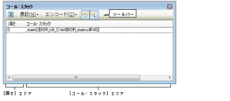 なお,各エリアの見方,および機能についての詳細は,コール・スタック パネルの項を参照してください。