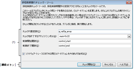 [チェック対象変数]で指定した変数に対して排他制御チェックを開始します。 チェック終了後,排他制御が正しく行われているかどうかの結果を関数変数アクセス表 パネルに反映し,このダイアログをクローズします。 |
