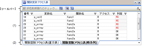 変数にアクセスしている関数を直交表で表示する[関数変数アクセス表(直交表)]タブと,排他制御チェック・ツールによって計測された排他制御の時系列情報を表示する[関数変数アクセス表(時系列)]タブの2つがあります。