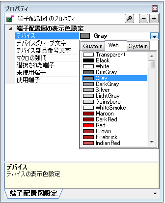 なお,表示色の選択は,プロパティ パネルの[端子配置図設定]タブ→[端子配置図の表示色設定]で該当色を選択することにより行います。