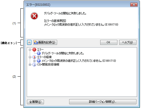 出力されたメッセージに詳細情報がある場合のみ対象となるエリアで,[詳細]ボタンをクリックすることにより表示されます(デフォルトでは表示されません)。