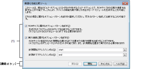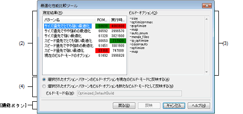 ビルド・ツールが推奨するビルド・オプションを適用した場合のROMサイズや実行速度を計測,比較するウィザード形式のダイアログです。