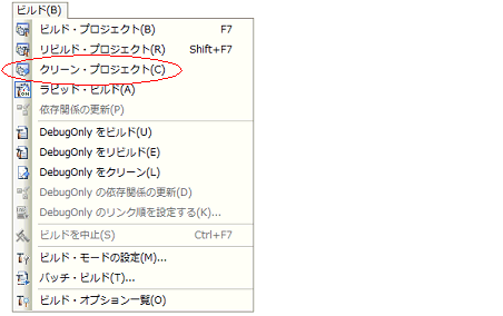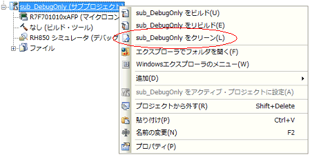 対象デバッグ専用プロジェクトを選択し,コンテキスト・メニューの[アクティブ・プロジェクトをクリーン]を選択してください。