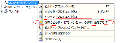 現在選択しているプロジェクト(メイン・プロジェクト,またはサブプロジェクト)のビルド・オプションを標準ビルド・オプションとする(太字表示を解除する)には,プロジェクト・ツリーでビルド・ツール・ノードを選択し,コンテキスト・メニューの[現在のビルド・オプションを選択しているプロジェクトの標準に設定する]を選択してください。