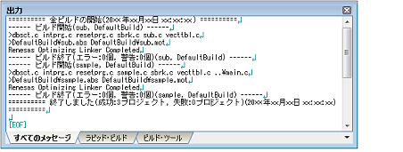 備考 2. | ビルド,リビルド,バッチ・ビルドを実行する際,エディタ パネルで編集中のファイルがある場合は,該当ファイルを一括して保存します。 |