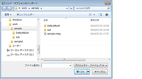 ダイアログ上でビルド・オプションのインポート対象となるプロジェクト・ファイルを選択し,[開く]ボタンをクリックしてください。