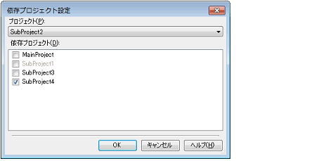 SubProject1の依存プロジェクトとしてMainProject,SubProject2を設定し,SubProject2の依存プロジェクトとしてSubProject4を設定した場合,ビルド順は以下のようになります。 |