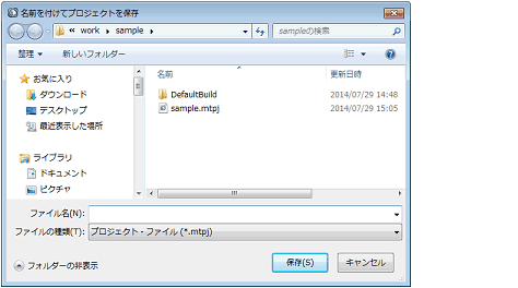 ダイアログ上で,保存先フォルダと別のプロジェクト・ファイル名(*.mtpj)を指定してください。指定したフォルダとファイル名でプロジェクト・ファイルを保存します。