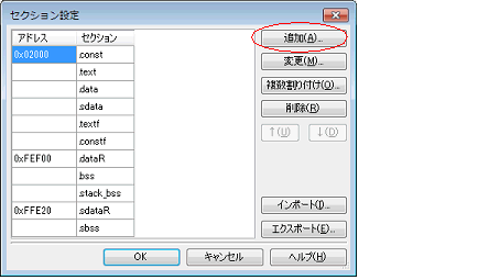 [セクション名]に追加したいRAMセクション名を入力し,[OK]ボタンをクリックすると,入力したセクションがセクション設定 ダイアログの[セクション]に追加されます。