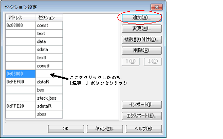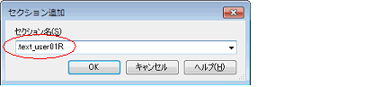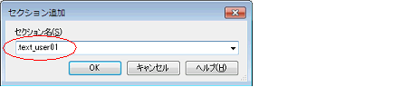 [セクション名]に追加したいROMセクション名を入力し,[OK]ボタンをクリックすると,入力したセクションがセクション設定 ダイアログの[セクション]に追加されます。