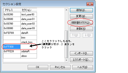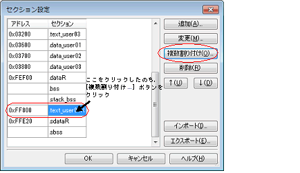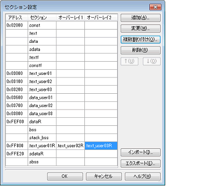 同一アドレスに配置するセクションについても同様に,[複数割り付け...]ボタンで追加します。