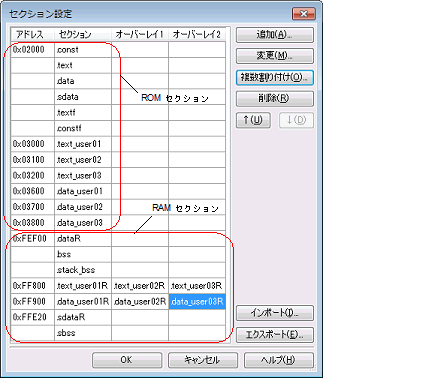 オーバーレイ・セクションの選択機能に対応するため,ROMからRAMへマップするセクション,およびオーバーレイ・セクションを設定します。