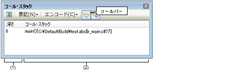 なお,各エリアの見方,および機能についての詳細は,コール・スタック パネルの項を参照してください。