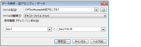 [ファイル]メニュー→[名前を付けて逆アセンブル・データを保存...]を選択すると,次のデータ保存 ダイアログがオープンします(この際,パネル上で範囲選択した状態でこの操作を行うと選択範囲のみの逆アセンブル・データを保存することができます)。