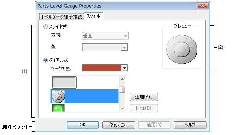 なお,レベル・ゲージの表示スタイルには,スライド式とダイアル式の2種類があり,これらスタイルの変更は[[スタイル]タブ]で行います。