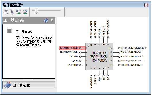 マイクロコントローラの各端子に関する情報の記述状況を確認するための端子配置図 パネルをオープンします。