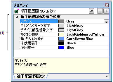 プロジェクト・ツリー パネルで選択した[端子配置図]に対応した情報(端子配置図の表示色設定)の表示,および設定の変更を行います。