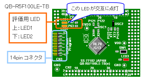 今回作成するプログラムは2つのLEDを交互に点滅させる簡単なプログラムです。プログラムの詳しい説明は付録の「サンプル・プログラムの説明」を参照してください。