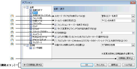 本ダイアログのすべての設定項目をデフォルトの状態に戻します。 ただし,[全般 - 外部ツール]カテゴリでは,新規登録した内容の削除は行いません。 |