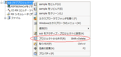 プロジェクトに登録しているサブプロジェクトをプロジェクトから外すには,プロジェクト・ツリーでサブプロジェクト・ノードを選択し,コンテキスト・メニューの[プロジェクトから外す]を選択してください。