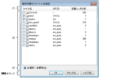 このダイアログで解析対象外と指定されたファイル内の関数情報/変数情報は,次のパネル上では表示されません。