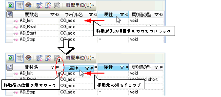 パネルのヘッダ・エリア左端の ボタンをクリックすることによりオープンする列の選択 ダイアログにおいて,移動対象の項目名を,マウスによりパネル上の任意の列(ヘッダ・エリア)へ直接ドラッグ・アンド・ドロップします。