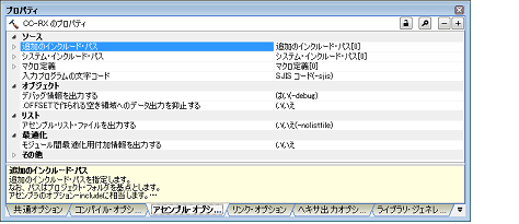 アセンブラのオプション-euc,-sjis,-latin1,-big5,-gb2312 に相当します。 なお,[繁体中国語 (-big5))],および[簡体中国語 (-gb2312)]は,[共通オプション]タブの[バージョン選択]カテゴリの[使用するコンパイラ・パッケージのバージョン]プロパティで[常にインストール済みの最新版]を選択し,インストールされている最新版がV2.00.00以上の場合,または[使用するコンパイラ・パッケージのバージョン]プロパティでV2.00.00以上を選択した場合に表示します。 また,[UTF-8 コード(-utf8)]は,[使用するコンパイラ・パッケージのバージョン]プロパティで[常にインストール済みの最新版]を選択し,インストールされている最新版がV2.04.00以上の場合,または[使用するコンパイラ・パッケージのバージョン]プロパティでV2.04.00以上を選択した場合に表示します。 |