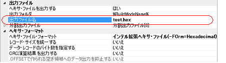 プロジェクト・ツリーでビルド・ツール・ノードを選択し,プロパティ パネルの[ヘキサ出力オプション]タブを選択します。[出力ファイル]カテゴリの[出力ファイル名]プロパティにおいて,変更するファイル名を入力してください。