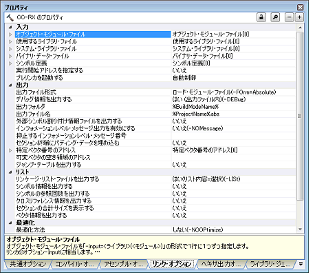 リンク・フェーズに対するオプションを設定するには,プロジェクト・ツリーでビルド・ツール・ノードを選択し,プロパティ パネルの[リンク・オプション]タブを選択してください。