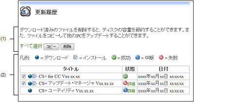 このページでは,アップデートの実行履歴が表示され,アップデート用ファイルのコピーと削除を行います。