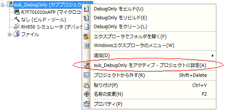 特定のデバッグ専用プロジェクト(メイン・プロジェクト,またはサブプロジェクト)を対象にビルドを行う場合,そのプロジェクトを“アクティブ・プロジェクト”として設定する必要があります。