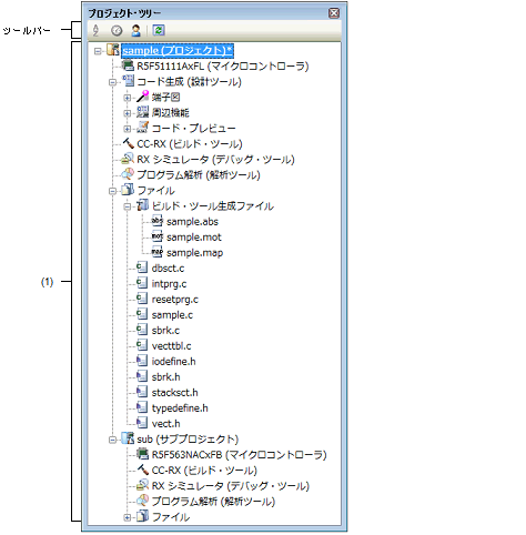 プロジェクトを構成するマイクロコントローラ,ビルド・ツール,ソース・ファイルなどの構成要素をツリー表示します。