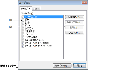 ツールバーの表示/非表示の設定,名称の変更,および新規ツールバーの作成を行います。