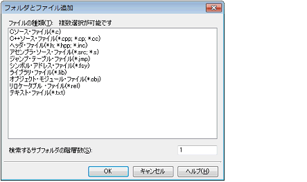 ダイアログ上で,プロジェクトに追加するファイルの種類を選択し,プロジェクトに追加するサブフォルダの階層数を指定したのち,[OK]ボタンをクリックしてください。