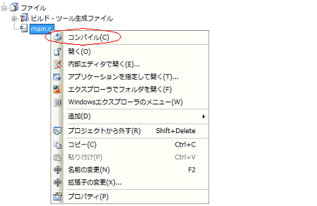 プロジェクト・ツリー でCソース・ファイルを選択し,コンテキスト・メニューの[コンパイル]を選択してください。