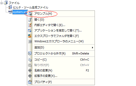 プロジェクト・ツリー でアセンブリ・ソース・ファイルを選択し,コンテキスト・メニューの[アセンブル]を選択してください。