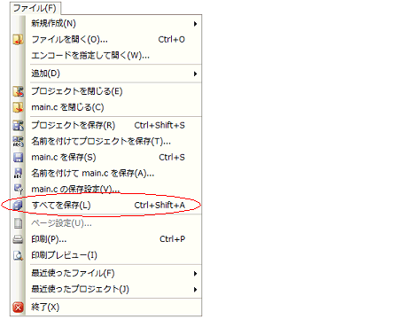 [ファイル]メニュー→[すべてを保存]を選択すると,現在の設定情報でプロジェクト・ファイルを上書きし,編集中のすべてのファイルを保存します。