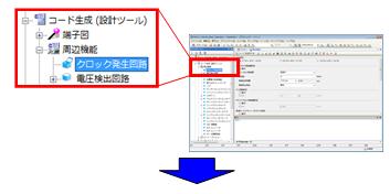 使用するマイコン内蔵周辺機能の設定を行います。コード生成ツールを用いることで,機能の選択や数値の入力といったGUI上の操作のみで,プログラムの自動生成が可能です。