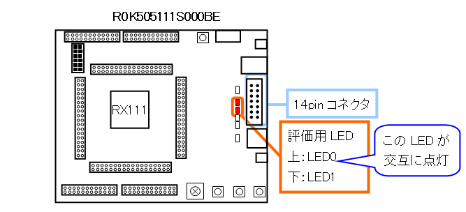 今回作成するプログラムは2つのLEDを交互に点滅させる簡単なプログラムです。プログラムの詳しい説明は付録の「サンプル・プログラムの説明」を参照してください。